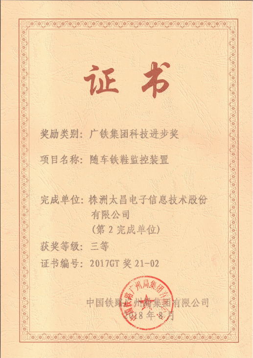 2018年8月獲得廣鐵集團科技進(jìn)步三等獎
